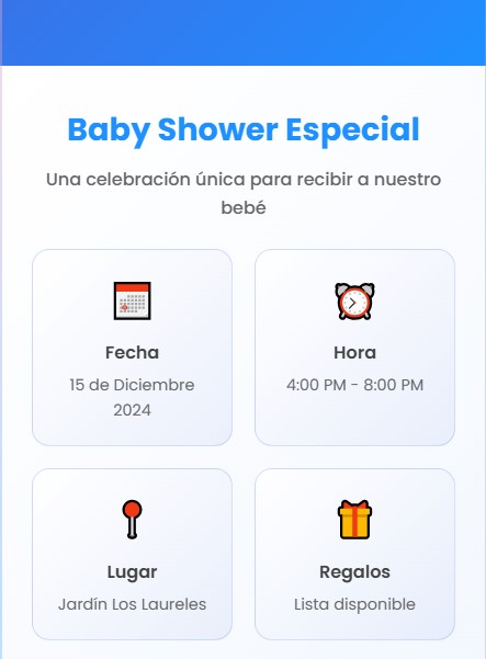 Diseños adaptables — desde bautismos y baby showers hasta bodas y cumpleaños. Estética premium: celeste→blanco con detalles dorados y glassmorphism.